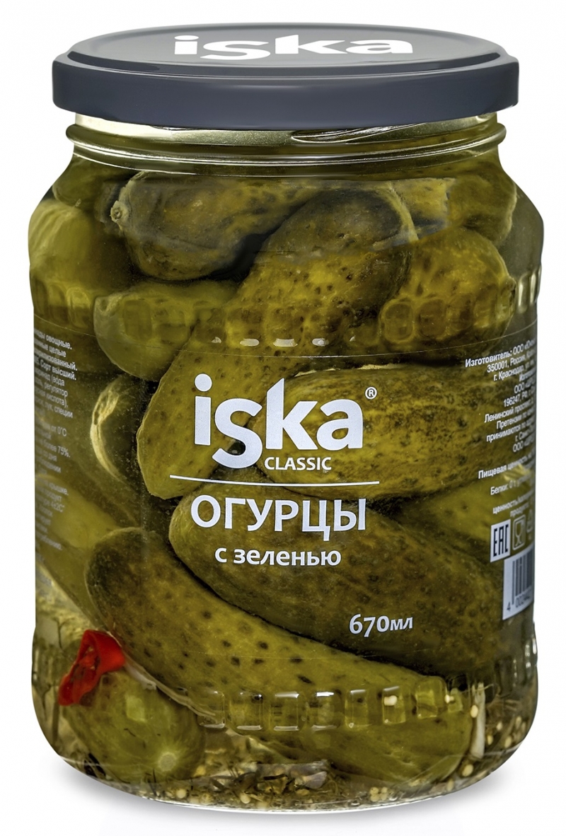 Огурцы Иска 650г маринованные с зеленью ст/б