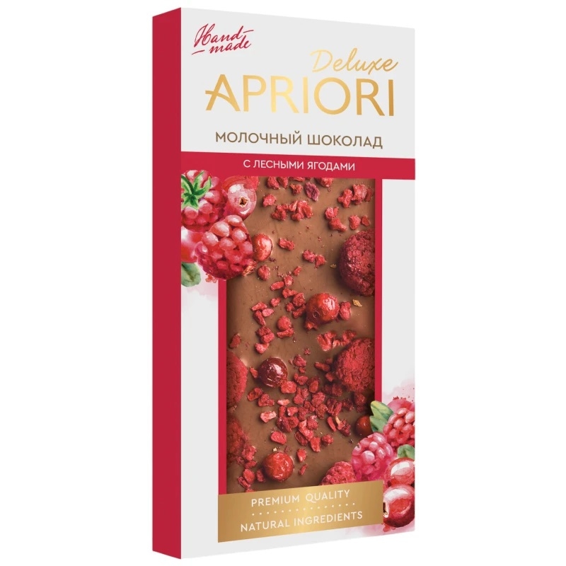 Шоколад молочный с лесными ягодами «Ягодный микс». Состав: молочная шоколадная масса (сахар, масло какао, молоко сухое цельное, какао тертое, сыворотка молочная сухая, молочный жир, эмульгатор соевый лецитин, ароматизатор «Ванилин»), малина сублимационной сушки (целые ягоды), малина сублимационной сушки (кусочки), молочный жир, брусника сублимационной сушки. Может содержать незначительное количество орехов (фундука, миндаля, грецкого ореха, кешью, пекана, фисташки), пшеничного глютена и яичных продуктов. В шоколадной массе: массовая доля общего сухого остатка какао не менее 31%, массовая доля сухого обезжиренного остатка какао не менее 2,5%, массовая доля сухого молочного остатка не менее 12%, доля молочного жира не менее 2,5%. Пищевая и энергетическая ценность в 100г: белки 5,5г, жиры 31г, углеводы 55г; 520ккал. Хранить при температуре от +5оС до +22оС и относительной влажности не более 75%. Срок годности 9 месяцев.