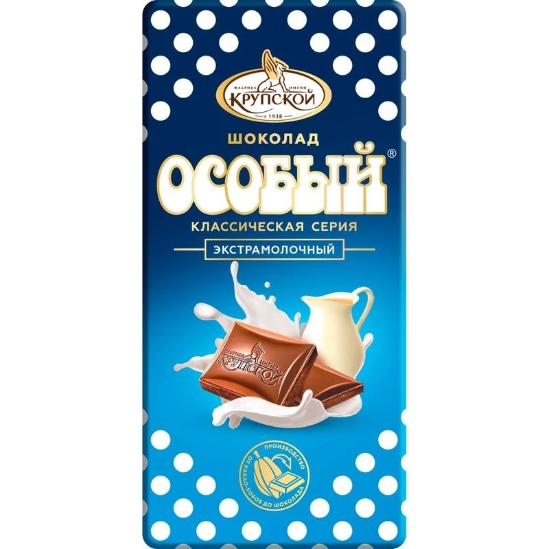 Классический молочный шоколад с увеличенным содержанием молочных продуктов. Экстрамолочный шоколад с тонкоизмельченными добавлениями «Особый». Состав: сахар, молоко цельное сухое, масло какао, какао тёртое, эквивалент масла какао (масла растительные, эмульгатор лецитины, антиокислитель концентрат смеси токоферолов), жир молочный, эмульгаторы (лецитин соевый, эфиры полиглицерина и взаимоэтерифицированных рициноловых кислот), ароматизатор (ванилин). Противопоказано при индивидуальной непереносимости к белку молока. Продукт может содержать следы миндаля, фундука, глютена, яичных продуктов. Шоколад содержит не более 5% эквивалентов какао масла. Массовая доля общего сухого остатка какао не менее 20%. Пищевая и энергетическая ценность в 100г: белки 7,5г, жиры 33г, углеводы 54г; 550ккал. Хранить при температуре от +15оС до +21оС. Срок годности 18 месяцев.