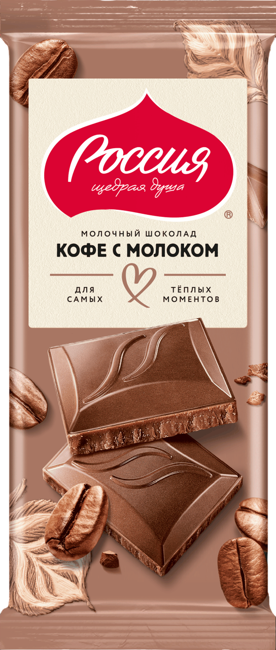 Кофе с молоком. Молочный шоколад с добавлем кофе. Состав: сахар, какао тертое, масло какао, молоко сухое обезжиренное, сыворотка молочная сухая, кофе растворимый, молоко сухое цельное, молочный жир, эмульгаторы (лецитины, Е476). Продукт может содержать сою, арахис, орехи, яичный белок и глютен, кунжут и диоксид серы.Молочный шоколад содержит: общий сухой остаток какао – не менее 25%. Пищевая и энергетическая ценность в 100г: белки 5,9г, жиры 30г, углеводы 59г; 524ккал. Хранить при температуре от +15°С до +21°С и относительной влажности воздуха не более 75%. Срок годности 12 месяцев.