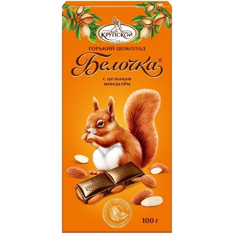 Шоколад Белочка 100г темный цельный миндаль