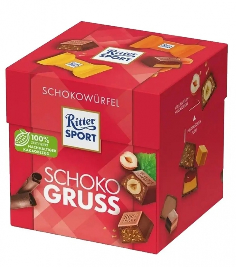Набор конфет из молочного шоколада. В набор входит 4 вида конфет из молочного шоколада. Состав: Конфета из молочного шоколада с крошкой из хрустящего печенья (сахар, масло пальмовое, какао тертое, сухое цельное молоко, масло какао, сухое обезжиренное молоко, лактоза, молочный жир, мука пшеничная, пшеничный солод, эмульгатор соевый лецитин, пшеничный крахмал, соль); Конфета из молочного шоколада с цельным лесным орехом и пралиновой начинкой (сахар, какао тертое, орехи лещины (цельные и дробленые), масло какао, сухое цельное молоко, ореховая паста (орех лещины), масло пальмовое, сухое обезжиренное молоко, лактоза, молочный жир, рис, эмульгатор соевый лецитин, соль ячменный солод); Конфета из молочного шоколада с жидкой карамелью и карамельным кремом (сахар, масло пальмовое, какао тертое, масло какао, сухое цельное молоко, глюкозно-фруктозный сироп, масло сливочное, сухая молочная сыворотка, лактоза, сухое обезжиренное молоко, мальтодестрин, молочный жир, молоко сгущенное с сахаром (молок