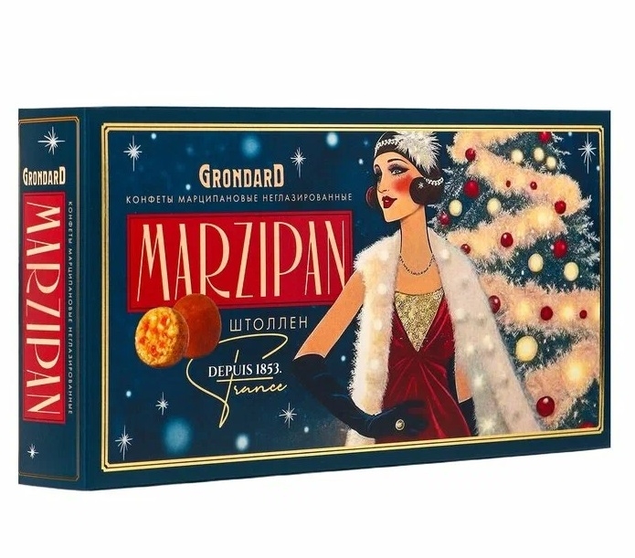 Конфеты неглазированные с корпусом из марципановой массы Штоллен. Состав: сахар, миндаль, цукаты морковные (сахар, морковь, кукурузный крахмал, регулятор кислотности (лимонная кислота), краситель кармин), влагоудерживающий агент (сорбит), сироп глюкозно-фруктозный, ароматизаторы пищевые натуральные, какао-порошок, молоко сухое обезжиренное, консервант (сорбат калия), корица молотая, сахар жженый карамелизованный, ферментный препарат микробного происхождения (инвертаза), регулятор кислотности (лимонная кислота). Может содержать следы орехов, арахиса, молочного белка, яиц, и продуктов их переработки. Пищевая и энергетическая ценность на 100г продукта: белки —6,6г, жиры — 15,1г, углеводы — 66,8г; 428ккал. Хранить при температуре от +15°С до +21°С и относительной влажности воздуха не более 75%. Срок годности 8 месяцев.