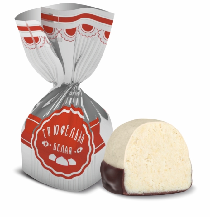 Трюфелька белая. Состав: сахар; жир кондитерский (рафинированное дезодорированное растительное масло в натуральном и модифицированном виде, эмульгатор лецитин соевый, антиокислитель Е306); сыворотка молочная сухая; мука пшеничная; вафли дробленые (мука пшеничная, разрыхлитель натрий двууглекислый, масло подсолнечное, соль поваренная пищевая, эмульгатор лецитин соевый); эмульгатор лецитин соевый; ароматизатор “Ирландский крем”; комплексная пищевая добавка - антиокислитель (эмульгатор Е432, антиокислители: Е300, Е307, средняя цепь триглицеридов); глазурь (сахар, заменитель масла какао (рафинированные дезодорированные растительные масла в натуральном и модифицированном виде, в том числе соевое, эмульгаторы Е492, Е322, антиокислитель Е306), какао-порошок, эмульгатор: лецитин соевый, ароматизатор: ванилин, комплексная пищевая добавка - антиокислитель (эмульгатор Е432, антиокислители: Е300, Е307, средняя цепь триглицеридов)). Продукт может содержать следы арахиса, орехов, яичных