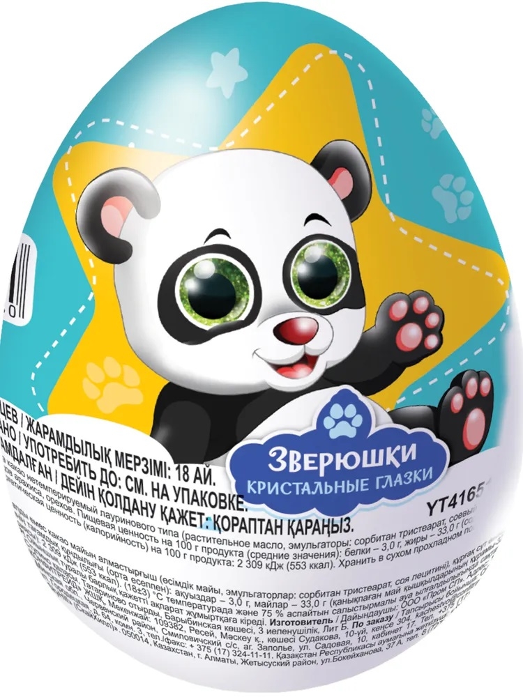 Изделие фигурное из глазури яйцо с подарком. Состав: сахар, заменитель масла какао нетемперируемый лауринового типа (фракция гидрогенизированного пальмоядрового масла, эмульгаторы: сорбитан тристеарат, соевый лецитин), сыворотка молочная сухая, какао-порошок, сухое цельное молоко, эмульгатор (соевый лецитин), ароматизаторы. Возможно наличие следов арахиса, орехов. Массовая доля общего сухого остатка какао - менее 15 %. Пищевая и энергетическая ценность на 100г продукта: белки - 3г, жиры - 33г (содержание насыщенных жирных кислот – 32,2г и трансизомеров ненасыщенных жирных кислот – 0г), углеводы - 61г, 553ккал. Хранить в сухом прохладном помещении при температуре от +15°С до +21°С и относительной влажности воздуха не более 75%, избегать прямого попадания. Срок годности 18 месяцев. Содержит игрушку.
