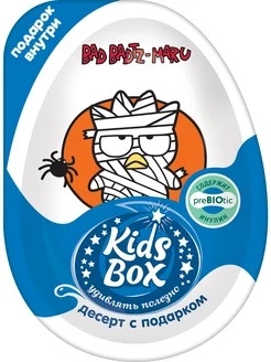 Изделие кондитерское сахаристое Десерт с подарком Kidsbox. Состав: паста (сахар, жир специального назначения (рафинированное дезодорированное фракционированное растительное масло: пальмовое, эмульгаторы (моно- и диглицериды жирных кислот, лецитины (соевые))), сыворотка молочная сухая, сухое цельное молоко, какао-порошок, пребиотик инулин, эмульгаторы (лецитины (соевые), Е476), ароматизаторы “Ванилин”, “Взбитые сливки”, “Горький шоколад”); печенье (мука пшеничная, сахар, жир кондитерский (рафинированные дезодорированные растительные масла в натуральном и модифицированном виде, эмульгатор (лецитины (соевые)), антиокислитель (токоферолы, концентрат смеси)), разрыхлители (гидрокарбонат аммония, гидрокарбонат натрия), ароматизатор). Возможно наличие следов арахиса, орехов. Пищевая и энергетическая ценность на 100г продукта (средние значения): белки - 5г, жиры - 31г, углеводы - 57г, пищевые волокна (пребиотик инулин) - 2,28г, 527 ккал. В одной порции продукта (20г) содержится 1,5% от рекоме