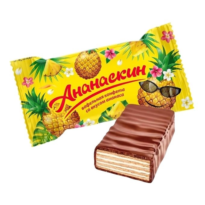 Конфеты вафельные глазированные с кремовой начинкой «Ананаскин». Состав: сахарная пудра, вафли листовые (мука пшеничная в/с, соль, рафинированный дезодорированный отбеленный пальмовый олеин, разрыхлитель Е503ii), жир кондитерский (рафинированное дезодорированное частично гидрогенизированное фракционированное пальмовое масло), мука пшеничная обжаренная, заменитель масла какао нетемперируемый лауринового типа (рафинированное дезодорированное гидрогенизированное фракционированное пальмоядровое масло), какао-порошок, сыворотка сухая молочная, регулятор кислотности кислота лимонная, эмульгатор соевый лецитин, ароматизаторы: «Ананас», «Сливки». Может содержать следы диоксида серы. Пищевая и энергетическая ценность в 100г: белки 5,5г, жиры 30г, углеводы 64г; 550ккал. Хранить при температуре от +15°С до +21°С. Срок годности 12 месяцев. СТО 97523561-0003-2015 ЕАС Изготовитель: ООО «Невский кондитер Белинский», 442250, Россия, Пензенская обл., Белинский р-н, г.Белинский, ул.Ленина, 84.