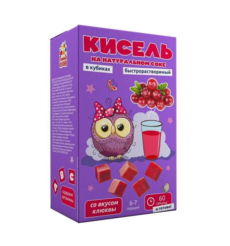 Концентраты пищевые сладких блюд: кисель витаминизированный быстрого приготовления со вкусом клюквы. Состав: сахар белый кристаллический, крахмал картофельный, сок фруктовый концентрированный, кислота лимонная (Е330) – регулятор кислотности, пищевая вкусоароматическая добавка «Клюква», премикс витаминный (А (ретинола ацетат), В1 (тиамина гидрохлорид), В2 (рибофлавин), С (аскорбиновая кислота)), натуральный пищевой краситель Кармин. Может содержать следы глютена, молока, сои, продуктов переработки яиц, орехов, горчицы, диоксида серы. Пищевая и энергетическая ценность в 100г: белки 0,2г, жиры 0,1г, углеводы 94г; 377ккал. Хранить при температуре от +15°С до +21°С. Срок годности 18 месяцев.