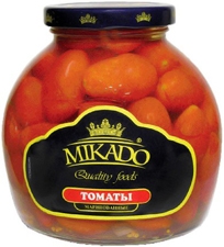 Консервы. Маринады овощные. Томаты маринованные. Состав: томаты черри свежие, вода питьевая, сахар, соль, уксусная кислота (регулятор кислотности), пряности (в том числе семена горчицы). Пищевая и энергетическая ценность в 100г: углеводы 3,5г; 14ккал. Хранить при температуре от 0оС до +25оС и относительной влажности воздуха не более 75%. Срок годности 2 года.