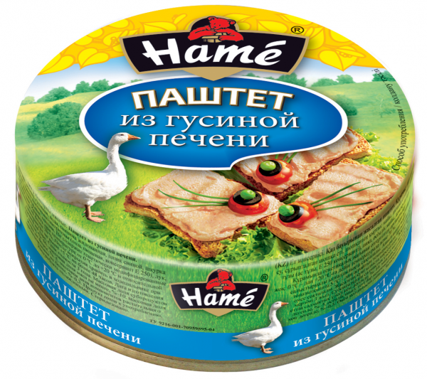 Состав: печень гусиная, мясо свиное, вода, шпик свиной, шкурка свиная, соль, лук, масло растительное, консервант Е250.