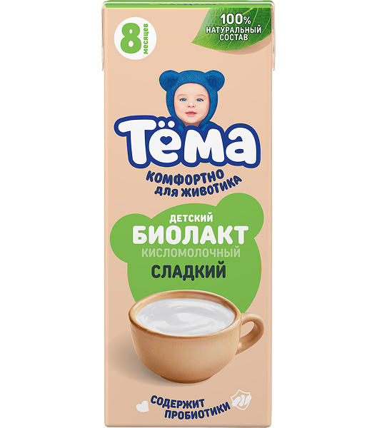 Продукт кисломолочный Биолакт сладкий для детей раннего возраста, с 8 месяцев.Состав: нормализованное молоко, сахарный сироп, закваска из термофильных молочнокислых стрептококков (Streptococcus Thermophilus) и молочнокислых ацидофильных палочек (Lactobacillus acidophilus). Пищевая и энергетическая ценность в 100г: жиры – 3,2г, белки – 2,8г, углеводы - 8,3г,74ккал. Хранить при t от +2оС до +6оС. Срок годности: 30 суток.