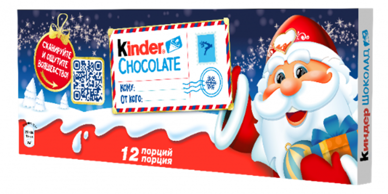 Шоколад молочный «KinderChocolate» с молочной начинкой. Состав: сахар, сухое цельное молоко, масло какао, тертое какао, эмульгатор: лецитины, ароматизатор, начинка: сахар, сухое обезжиренное молоко, растительный жир, молочный жир, эмульгатор: лецитины, ароматизатор. Пищевая и энергетическая ценность в 100г: белки 8,7г, жиры 35г, углеводы 53,5г; 566ккал. Срок годности 9 месяцев при температуре от +15оС до +22оС.