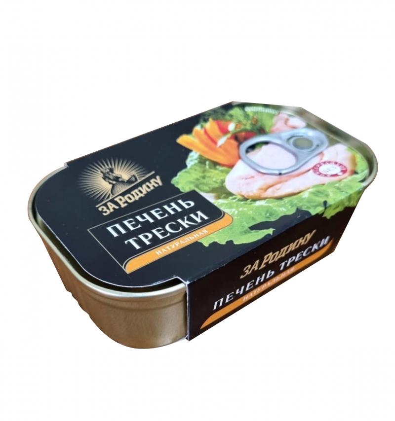 Пищевая рыбная продукция. Натуральные рыбные консервы стерилизованные. Печень трески натуральная. Состав: Печень трески атлантической (куски), соль, пряности. Пищевая и энергетическая ценность в 100г: белки-4г; жиры-56г; 610ккал. Хранить при температуре от 0оС до +20оС и относительной влажности воздуха не более 75%. Срок годности 30 месяцев