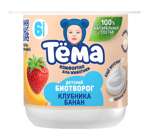 Биотворог обогащенный бифидобактериями с клубникой и бананом, для питания детей старше 6-ти месяцев. Состав: нормализованное молоко, наполнитель (сахар, вода, пюре банана, концентрированное пюре клубники, концентрированный сок банана, кукурузный крахмал; концентрированные соки красной свеклы, моркови, лимона; натуральные ароматизаторы), закваска молочнокислых культур и бифидобактерий. Количество бифидобактерий не менее1х10 6 КОЕ/г. Пищевая и энергетическая ценность в 100г: жиры –4г, белки – 7,5г, углеводы - 10,1г,106ккал. Хранить при температуре от +2оС до +6оС. Срок годности: 30 суток.