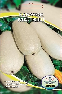 Кабачок Малыш. Скороспелый сорт. Кустового типа. Плоды белого цвета, суженные к плодоножке, с плотной светлой мякотью внутри. Вырастают в длину до 20см и достигают массы 0,6-1,0кг.