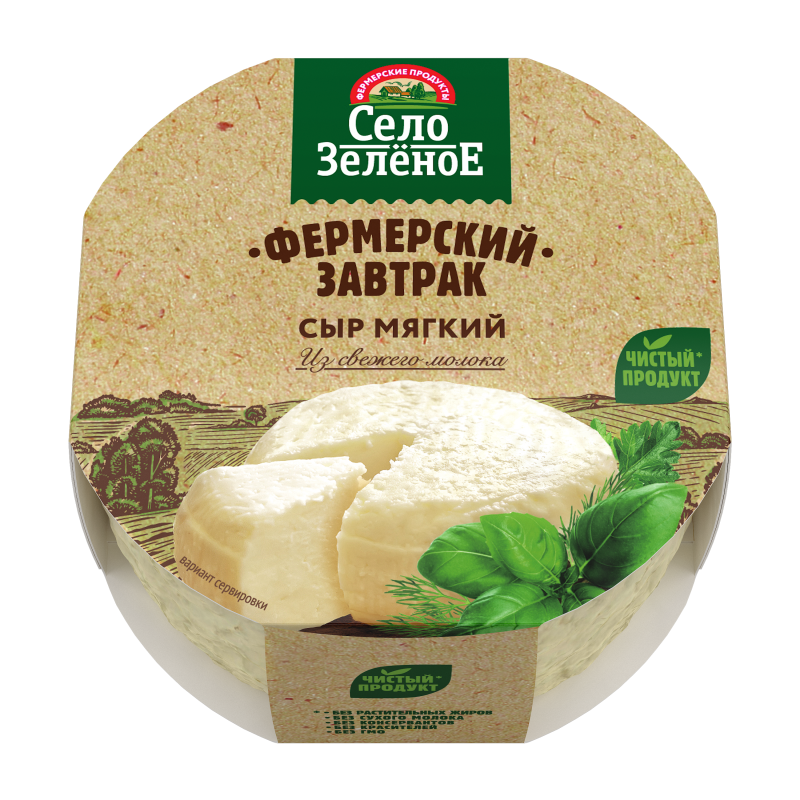 Сыр мягкий Фермерский завтрак массовая доля жира в сухом веществе 45%. Состав: молоко пастеризованное, сыворотка молочная деминерализованная сгущенная, соль, регулятор кислотности – молочная кислота. Пищевая и энергетическая ценность в 100г: белки 16,5г, жиры 18г, 228ккал. Хранить при температуре от +2оС до +6оС и относительной влажности воздуха от 80% до 85% включительно 120 суток. После вскрытия хранить при температуре от +2оС до +6оС не более 5 суток в пределах срока годности.