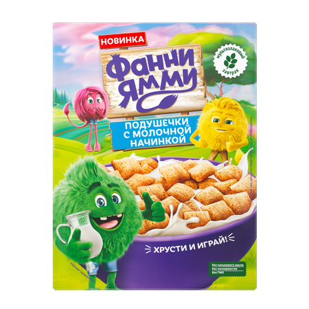 Главная / Каталог / Бакалея / Сухие завтраки, попкорн / Подушечки Фанни Ямми мультизлаковые 220г с молочной начинкой
