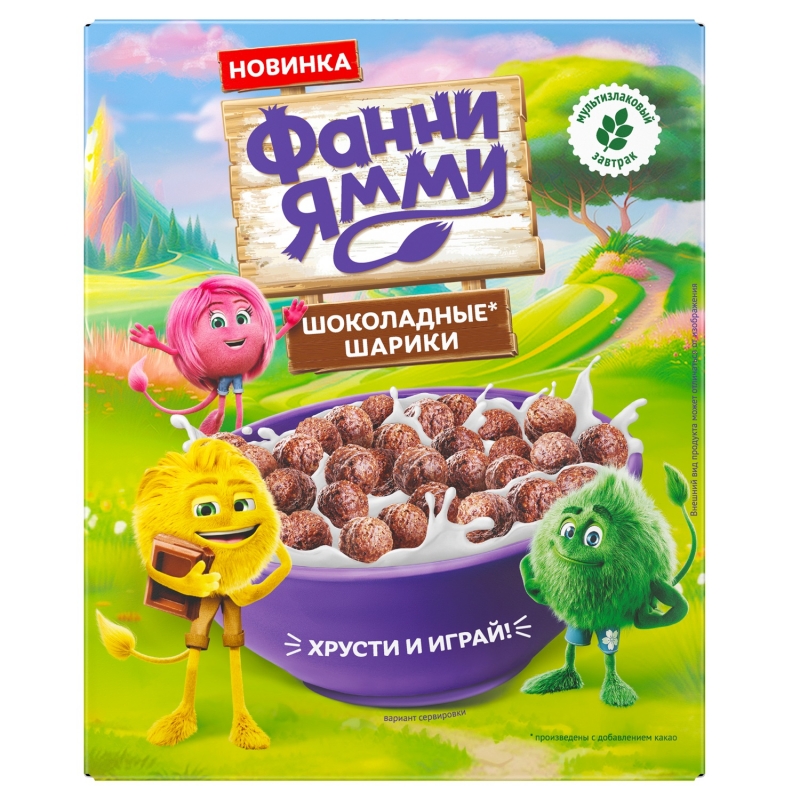 Готовый завтрак мультизлаковый: шарики с какао «шоколадные». Состав: зерновые продукты (крупа кукурузная, мука пшеничная цельнозерновая, мука пшеничная хлебопекарная 1 сорт), сахар, какао-порошок, патока, масло растительное (подсолнечное), соль, ароматизаторы, эмульгатор соевый лецитин. Может содержать молоко (в том числе лактозу) и продукты его переработки. Пищевая и энергетическая ценность в 100г: белки 8,5г, жиры 2,5г, углеводы 76г; 360ккал. Хранить при температуре не выше +20оС и относительной влажности воздуха не более 75%. Срок годности 8 месяцев.