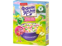 Готовый завтрак мультизлаковый: шарики со вкусами яблока, клубники, банана «микс фруктовых вкусов». Состав: зерновые продукты (мука пшеничная хлебопекарная 1 сорт, крупа кукурузная, мука рисовая), сахар, растительный экстракт спирулины, красители (бета-каротин, кармины), патока, соль, ароматизаторы. Может содержать молоко (в том числе лактозу), сою и продукты их переработки. Пищевая и энергетическая ценность в 100г: белки 7г, жиры 1г, углеводы 84г; 370ккал. Хранить при температуре не выше +20оС и относительной влажности воздуха не более 75%. Срок годности 8 месяцев.