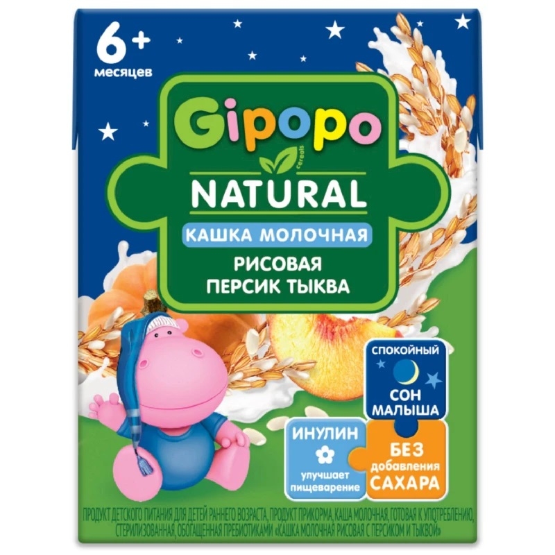 Продукт детского питания для детей раннего возраста, продукт прикорма, каша молочная, готовая к употреблению, стерилизованная, обогащенная пребиотиками. Состав: молоко нормализованное, вода питьевая, мука рисовая, пюре из тыквы, концентрированный яблочный сок, пюре персика концентрированное, мальтодекстрин, пребиотик - инулин, регулятор кислотности - цитрат натрия, натуральный ароматизатор. Без добавления сахара. Содержит сахара природного (естественного) происхождения. Пищевая и энергетическая ценность в 100г: белки 2,7г, жиры 2г, углеводы 11,4г, 75ккал. Хранить при температуре от +2оС до +25оСи относительной влажности воздуха не более 75%. Срок годности 6 месяцев.