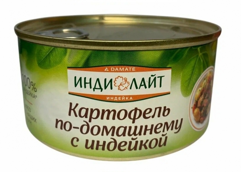 Консервы из мяса индейки в желе стерилизованные. Состав: мясо индейки, картофель, масло подсолнечное, лук репчатый, морковь, соль, базилик, вода, перец черный. Продукт производится на предприятии, осуществляющем переработку индейки, баранины, говядины. Пищевая и энергетическая ценность на 100г: белки 6г, жиры 10г, углеводы 11г; 160Ккал. Хранить при температуре от 0оС до +20оС и относительной влажности воздуха не более 75%. Срок годности 24 месяца.