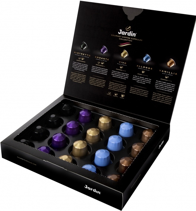 Набор Ассорти кофе в капсулах Жардин. Состав: кофе жареный молотый Жардин Аллонге, кофе жареный молотый с ароматом ванили Жардин Ванилла, кофе жареный молотый Жардин Анданте, кофе жареный молотый Жардин Ристретто, кофе жареный молотый Жардин Виво. Хранить в защищенном от прямых солнечных лучей месте при температуре не выше 30°С и относительной влажности воздуха не более 75%. Срок годности 24 месяца.