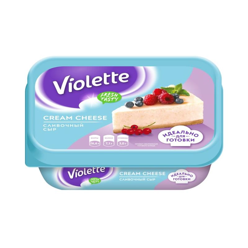 Сыр творожный. Массовая доля жира в сухом веществе 70%. Состав: молоко цельное, сливки, молочный белок, стабилизаторы (камедь рожкового дерева, Е407), мальтодекстрин, соль пищевая (содержит антислеживающий агент ферроцианид калия), сахар, бактериальная закваска молочнокислых микроорганизмов, молокосвертывающий фермент микробного происхождения. Пищевая и энергетическая ценность в 100г: белки 7,1г, жиры 26,6г, углеводы 3г; 280ккал. Хранить при температуре от 0°С до +8°С. Срок годности 130 суток.