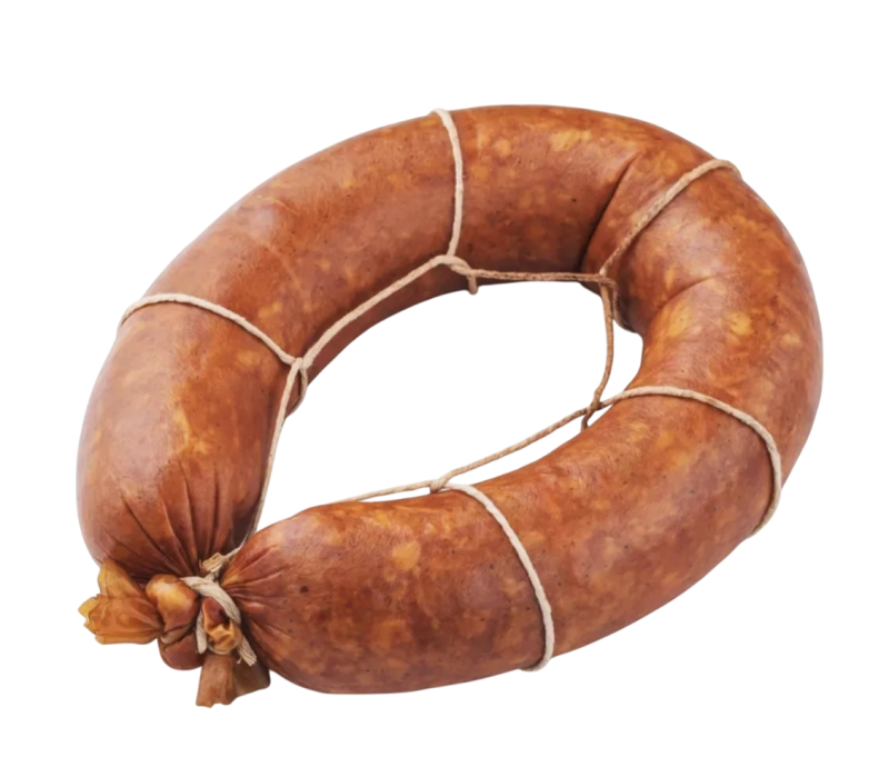 Состав: свинина, говядина, шпик, вода питьевая, чеснок, нитритно-посолочная смесь (соль, фиксатор окраски (нитрит натрия)), комплексная пищевая добавка (регулятор кислотности (трифосфат натрия), стабилизаторы (пиро- и полифосфаты натрия), декстроза, соль, антиокислитель (аскорбат натрия), ароматизатор (мясной тип), краситель (кармин)), перец черный молотый, гемоглобин. На предприятии используются соя, яйца, глютен, молоко, орехи, горчица и продукты их переработки. Пищевая и энергетическая ценность в 100г: белки 14г, жиры 30г; 330ккал. Хранить при температуре от 0°С до +6°С. Срок годности 72 часа.
