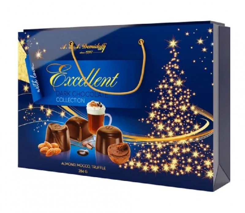 Ассорти конфет в темном шоколаде с начинками: трюфельный крем, миндальный крем, мокко. Состав: темный шоколад (какао тертое, сахар, масло какао, жир молочный, эмульгатор соевый лецитин, ароматизатор «Ванилин»), сахар, жир специального назначения, молоко обезжиренное сухое, молоко цельное сухое, какао-порошок, ядро миндаля жареное тертое, кофе жареный молотый, сыворотка молочная сухая, лактоза, эмульгаторы: соевый лецитин, Е476, ароматизаторы: «Трюфель», «Миндаль», «Кофе «Мокко». Возможно наличие следов фундука, арахиса. Хранить при температуре от +15оС до +21оС и относительной влажности воздуха не более 75%. Срок годности 9 месяцев.