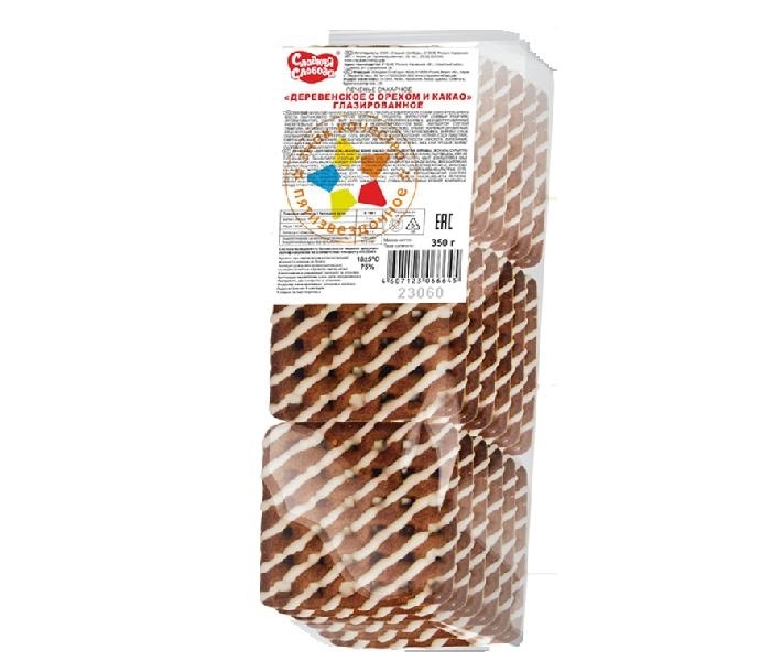 Печенье на деревенском молоке Деревенское с орехом и какао глазированное. Состав: мука пшеничная высшего сорта, глазурь кондитерская (сахар, заменитель какао-масла лауринового типа (текстурированное, рафинированное, полностью гидрогенезированное пальмоядровое масло), сухие молочные продукты, эмульгатор (соевый лецитин), ароматизатор), сахар, жир кондитерский (рафинированные дезодорированные растительные масла в натуральном и модифицированном виде, эмульгатор (соевый лецитин), антиокислитель (токоферолы, концентрат смеси)), арахис жареный дроблёный, яйцо куриное (меланж), какао-порошок, молоко питьевое пастеризованное, молоко сухое обезжиренное, фундук тертый, соль, разрыхлители (гидрокарбонат натрия (сода пищевая), гидрокарбонат аммония), ароматизатор, регулятор кислотности (кислота лимонная). Противопоказано при индивидуальной непереносимости молока, яиц, сои, арахиса, фундука. Продукт может содержать следы кунжута. Пищевая и энергетическая ценность в 100г продукта: Белки 7,5г, Жиры
