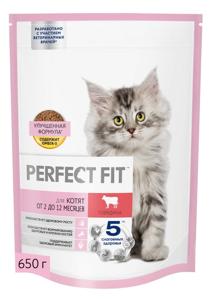 Корм сухой полнорационный «Говядина» для котят от 2 до 12 месяцев с говядиной. Состав: дегидратированный белок животного происхождения (в том числе из говядины), белки злаков, рис, кукурузная мука, животные жиры и растительные масла (в том числе рыбий жир), белок сои, пшеничная мука, гидролизат продуктов животного происхождения, минеральные вещества, дрожжи, высушенная мякоть сахарной свеклы, витамины, аминокислоты (метионин, таурин), антиоксиданты. Содержание питательных веществ в 100г: белок 40г, жир 15г, зола 8,5г, клетчатка 1,5г; витамин А 700МЕ; витамин Е 20мг. Добавленные вещества (1кг): витамин D3 2039 МЕ, витамин В1 24мг, витамин В2 9мг, витамин В3 136мг, витамин В5 23мг, витамин В6 7мг, витамин В9 2мг; таурин 836мг, метионин 3399мг, сульфат цинка 574мг, сульфат железа 198мг, сульфат марганца 57мг, сульфат меди 48мг, йодат кальция 8мг, селенметионин 170мг, холин 2987мг. Энергетическая ценность в 100г: 397ккал. Хранить при температуре от +4°С до +35°С и относительной влажности н