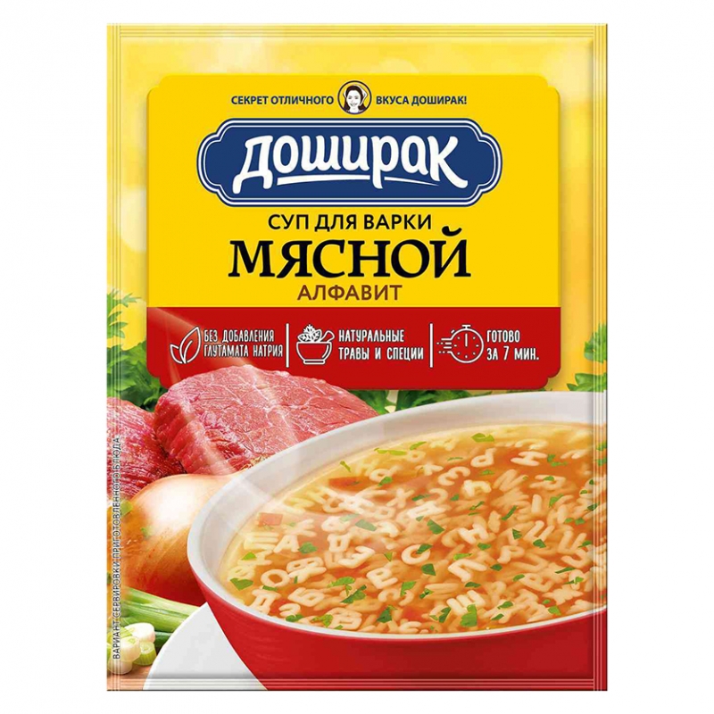 Суп для варки «Мясной алфавит». Состав: макаронные изделия - алфавит (мука пшеничная, вода); соль; кукурузный крахмал; овощи (морковь, лук жареный, томат, чеснок); экстракты дрожжей; мальтодекстрин; растительный жир (пальмовый); масло подсолнечное; травы и специи (петрушка, черный перец, лавровый лист, мускатных орех, куркума); ароматизатор; картофельные хлопья (картофель, эмульгатор (моно- и диглицериды жирных кислот), стабилизатор (дигидропирофосфат натрия), антиокислитель (аскорбилпальмитат), регулятор кислотности (лимонная кислота), консервант (пиросульфит натрия), краситель (куркумин); мясо говяжье (содержит антиокислитель экстракт розмарина); краситель сахарный колер IV. Продукт может содержать следы горчицы, сои, сельдерея, яиц и молока. Пищевая и энергетическая ценность в 100г: белки 9г, жиры 8,5г, углеводы 60г; 390ккал. Хранить при температуре не более +25°С. Срок годности 15 месяцев.