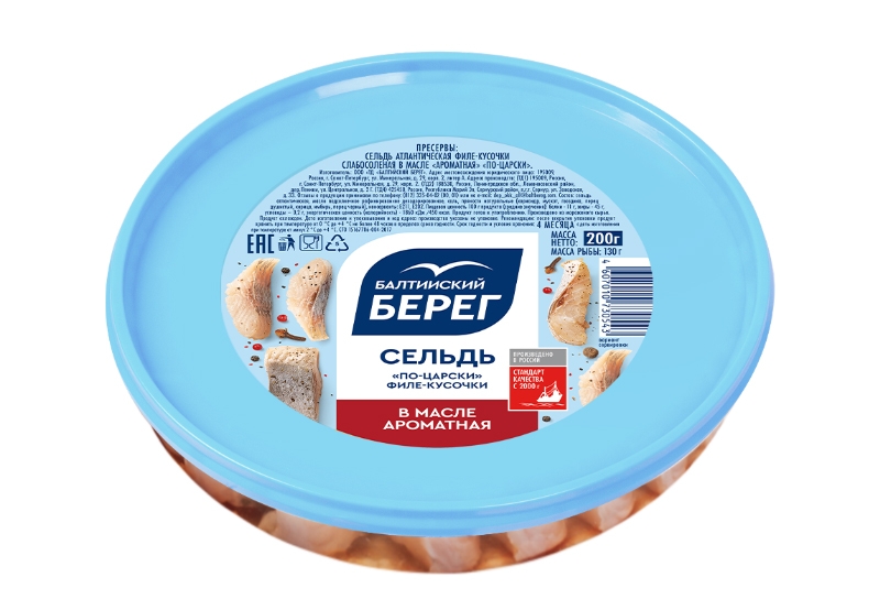 Главная / Каталог / Рыба, морепродукты / Пресервы / Сельдь Балтийский берег По-Царски филе-кусочки в масле 200г ароматная