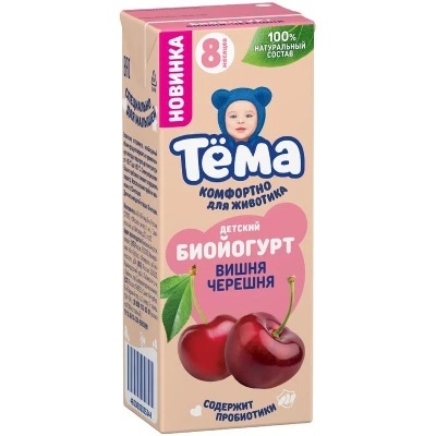 Биойогурт, обогащенный бифидобактериями, с вишней и черешней, для питания детей старше 8 месяцев. Состав: нормализованное молоко, наполнитель (сахар, вода, пюре вишни, концентрированный сок черешни, концентрированный сок черной моркови (содержит лимонную кислоту), загуститель пектины, концентрированный сок лимона, ароматизатор натуральный), закваска йогуртовых культур и бифидобактерий. Пищевая и энергетическая ценность в 100г: белки 3г, жиры 2,5г, углеводы 9,7г; кальций 100мг; 73ккал. Хранить при температуре от +2°С до +6°С. Срок годности 32 суток. Использование трубочки возможно с 12 месяцев.