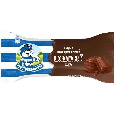 Сырок глазированный с какао и шоколадным вкусом, массовая доля жира в творожной части 23%. Состав: творожная часть (творог, сахар, масло сливочное, какао-порошок, натуральный ароматизатор (содержит кофеин), консервант (сорбат калия)); жировая глазурь (сахар, заменитель масла какао нетемперируемый лауринового типа (гидрогенизированное пальмоядровое масло, эмульгаторы (Е492, лецитины (из сои)), растительное масло (кокосовое), какао-порошок, сухое обезжиренное молоко, сухая молочная сыворотка, эмульгаторы (лецитины (из сои), Е476), ароматизаторы). Пищевая и энергетическая ценность в 100г: белки 10г, жиры 26г (в творожной части 23г), углеводы 34г; 410ккал. Хранить при температуре от +2°С до +6°С. Срок годности 35 суток.